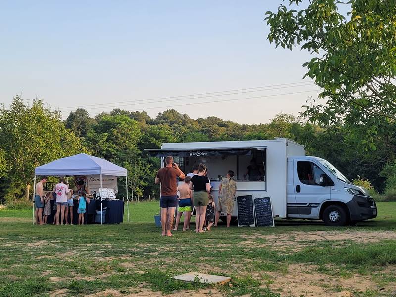 Dans notre accueil, vous pouvez vous rendre pour une boisson fraîche, une glace et des produits d'épicerie simples. Pendant l'été, nous proposons chaque jour un service du pain et chaque soir un repas à emporter, dont notre célèbre pizza partagée le mercredi. Hors saison, uniquement sur demande.
